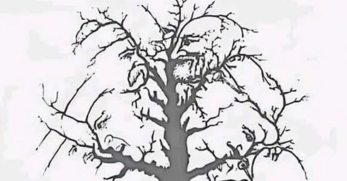 La prima vedere, această imagine pare a fi un simplu desen al unui copac cu ramuri goale. Dar dacă te uiți mai atent, vei observa ceva fascinant ascuns în desenul său — fețe atent integrate în liniile ramurilor și trunchiului. Ceea ce la prima vedere pare a fi ramuri obișnuite se transformă rapid într-o iluzie optică complexă, arătând cum mintea noastră este programată să găsească forme umane în locuri neașteptate.