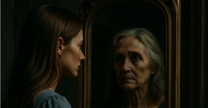 Cu fiecare zi, schimbările deveneau tot mai vizibile. Pe frunte apăreau riduri, pomeții se lăsau, părul începea să încărunțească. Anna își atinge nervos fața, dar pielea rămânea tânără. Doar reflexia continua să îmbătrânească.