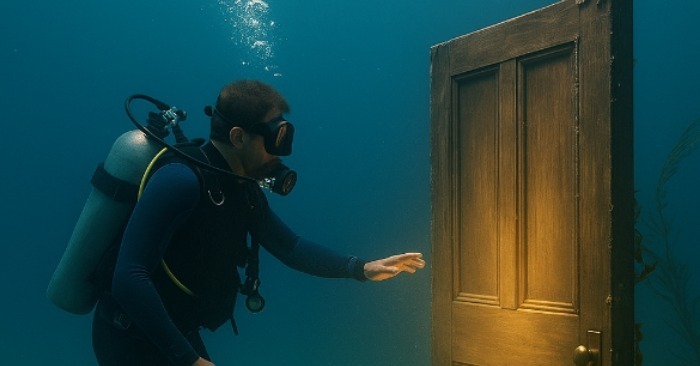 O ușă de lemn, în picioare în nisip, erodată de vreme, dar intactă. Pe suprafața ei erau lipite scoici, iar în jurul cadrului se înfășurau leneș alge. Dar stătea singură — nu era fixată nici de pereți, nici de vreo structură. Doar o ușă, stând acolo unde nu ar fi trebuit să fie uși.
