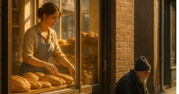 Și lângă el – un bătrân fără adăpost, așezat pe o treaptă, care mânca exact pâinea pe care ea o cocea în fiecare dimineață.