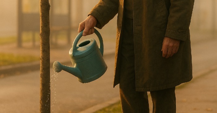 În fiecare dimineață, fix la șapte și jumătate, venea cu o stropitoare mică de plastic și uda un copac chiar la marginea stației de autobuz.