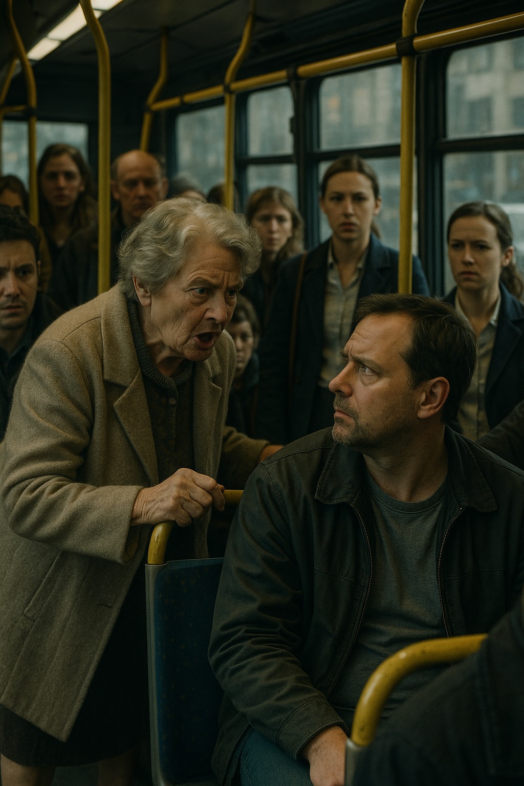 Tensiunea a crescut. Unul dintre pasageri a scos un telefon, gata să înregistreze scena. Șoferul s-a uitat neliniștit în oglinda retrovizoare. Părea că era pe cale să izbucnească o ceartă.