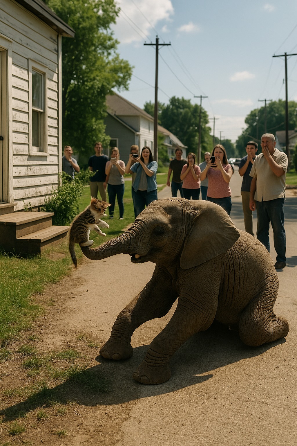 Elefantul a ajuns la o casă veche de la periferie și s-a oprit brusc. Și-a întors capul spre verandă și toată lumea a văzut: un pisoi mic și tigrat stătea acolo. Slăbuț, abia putând să se țină pe lăbuțe, mieuna jalnic. Și apoi s-a întâmplat ceva incredibil.