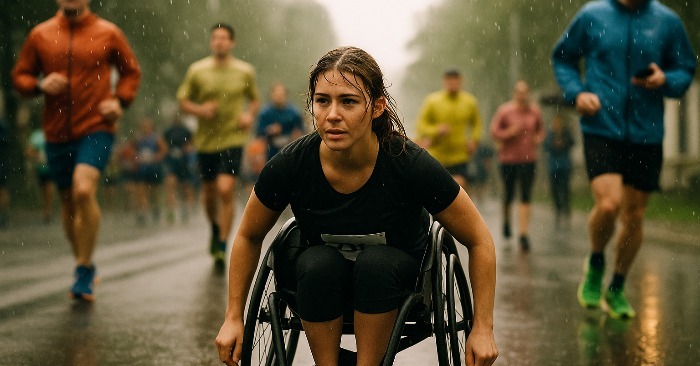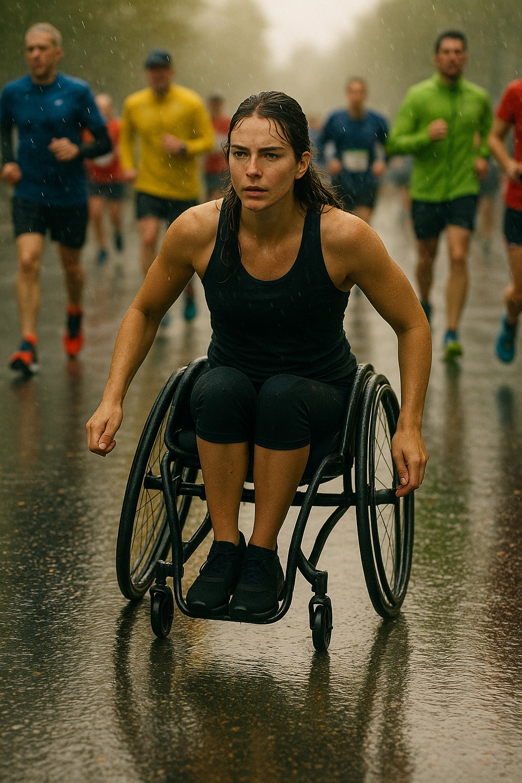 Când s-a auzit împușcătura, toate distragerile inutile au dispărut. Mulțimea se mișca – unele repede, altele încet. Leia simțea roțile de sub mâinile ei răspunzând la fiecare împingere, picăturile de ploaie prelingându-i-se pe obraji și amestecându-se cu respirația ei. Lumea se îngusta la drum și inima ei. La kilometrul zece, nu mai putea vedea spatele alergătorilor – doar o linie gri de asfalt care se întindea la infinit.
