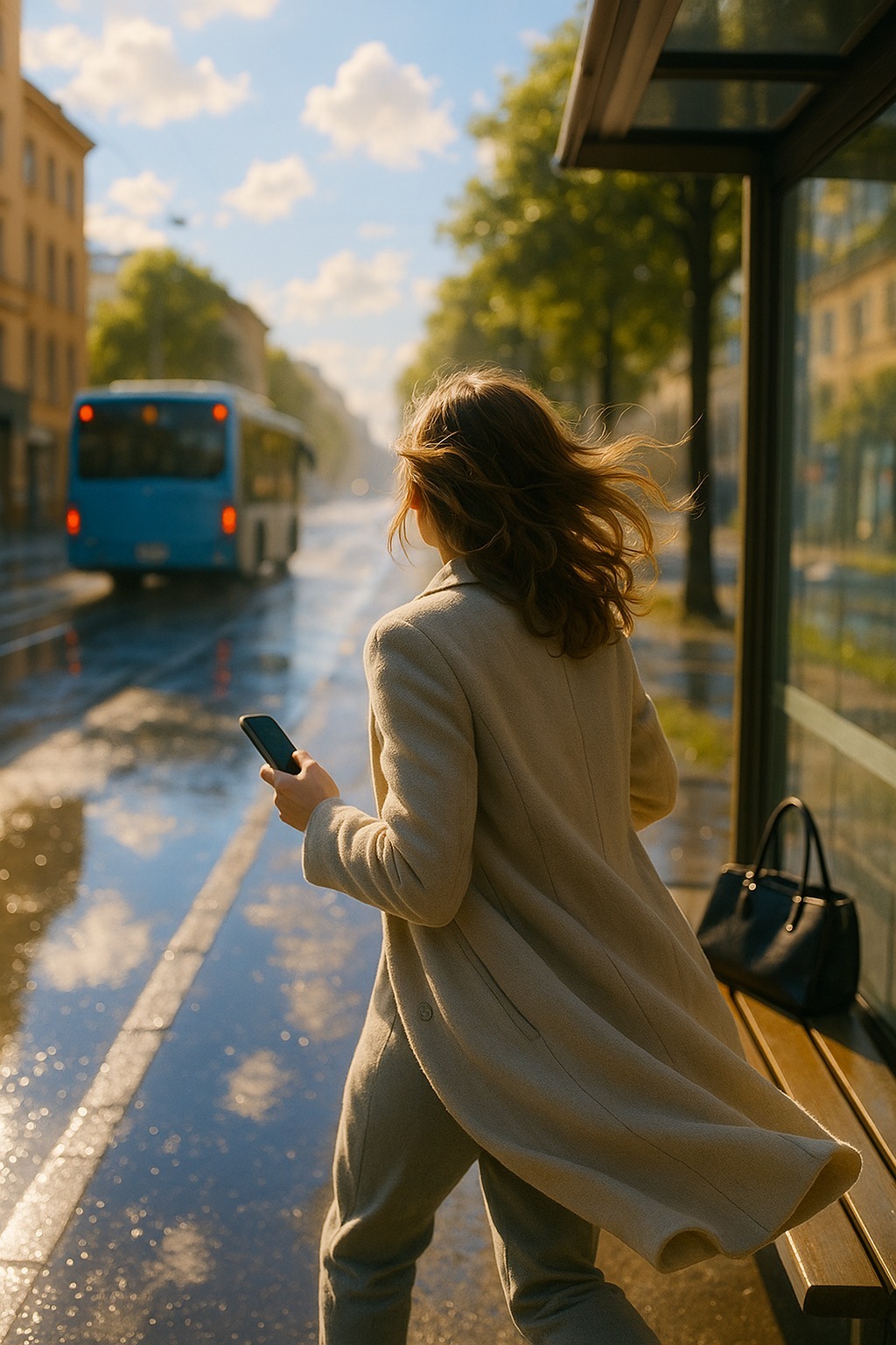 Sta pe loc, cu ușile deschise, șoferul aprinzându-și o țigară la volan. Și-a grăbit pasul. Dar când semaforul a pâlpâit, șoferul și-a aruncat țigara, a oftat și a închis ușile. „Stai!”, a strigat ea, dar autobuzul deja plecase.