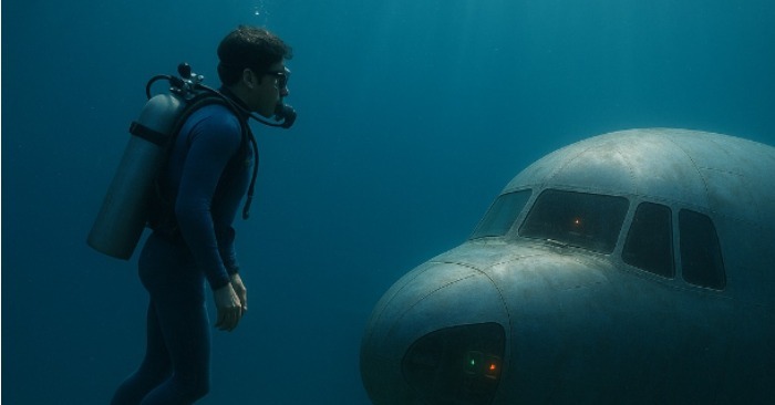 Dar, pe măsură ce înota mai aproape, inima i s-a strâns: în fața lui se afla un avion.