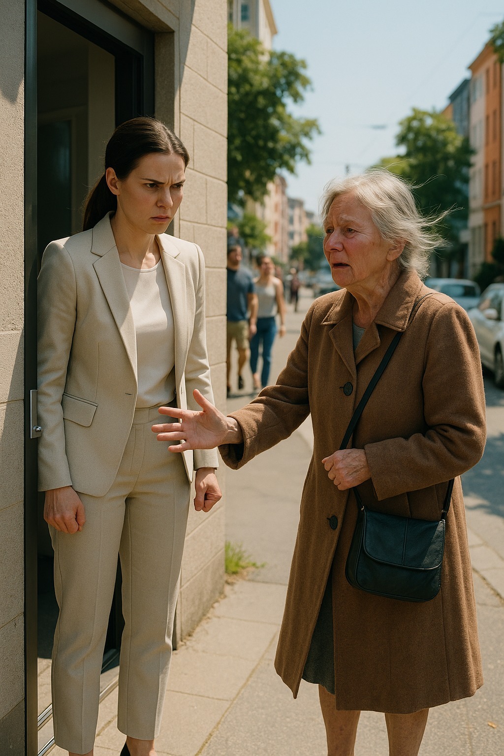 Bătrâna stătea tăcută în prag, purtând o haină veche și o geantă ponosită pe umăr.