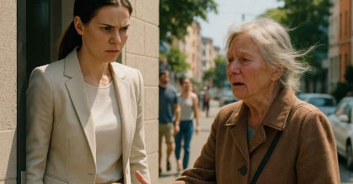 Bătrâna stătea tăcută în prag, purtând o haină veche și o geantă ponosită pe umăr.