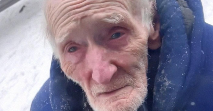 Păr gri, sub o căciulă tricotată, o haină maro uzată, mănuși fără degete.