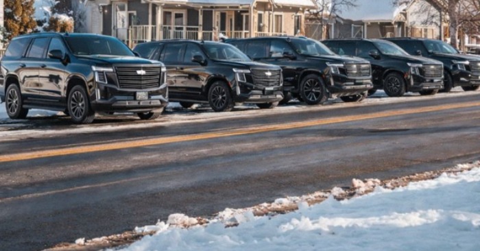 Cinci SUV-uri negre stăteau pe stradă. Doi bărbați în costume la ușă. Unul se uita la ceas, celălalt stătea nemișcat.