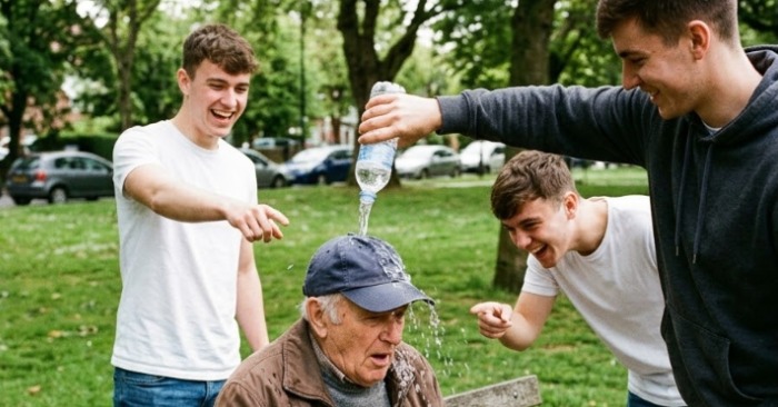 Unul dintre tineri a desfăcut capacul unei sticle de plastic și a turnat brusc toată apa direct peste capul bătrânului. Apa i-a curs peste șapcă și peste jachetă, în timp ce al doilea râdea tare și filma totul cu telefonul.