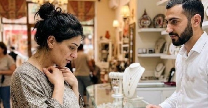 În vocea ei se simțea un tremur, dar a luat cu grijă colierul și l-a pus pe vitrina de sticlă. Pentru un moment, magazinul a devenit neobișnuit de tăcut. Tânărul vânzător a luat bijuteria, a privit-o atent și după câteva secunde a spus: