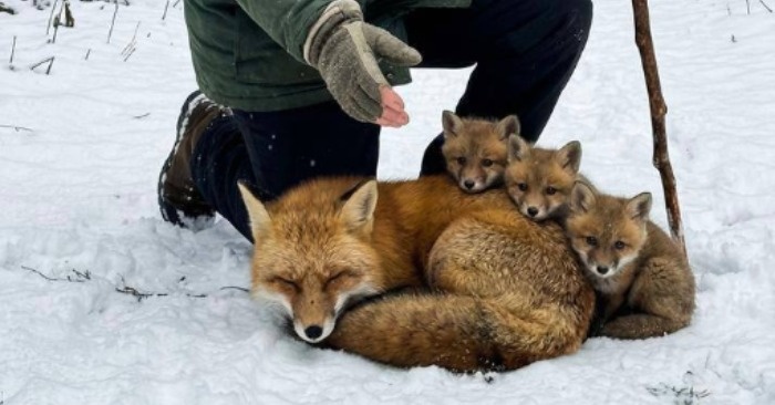 După câteva minute a ajuns într-o mică adâncitură, care era aproape complet acoperită de zăpadă. Acolo, la rădăcinile unui molid bătrân, zăcea o vulpe femelă. Un animal mare, roșcat. Zăpada începuse deja să-i acopere blana și era imediat clar că era moartă. Dar sub corpul ei se mișca ceva.