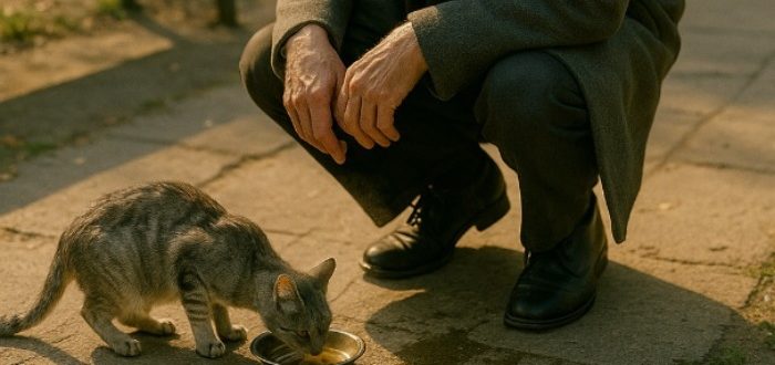 A observat-o din întâmplare – o pisică slabă și gri care stătea la intrare, privind lumea cu oboseala unui bătrân. La început, pur și simplu a trecut pe