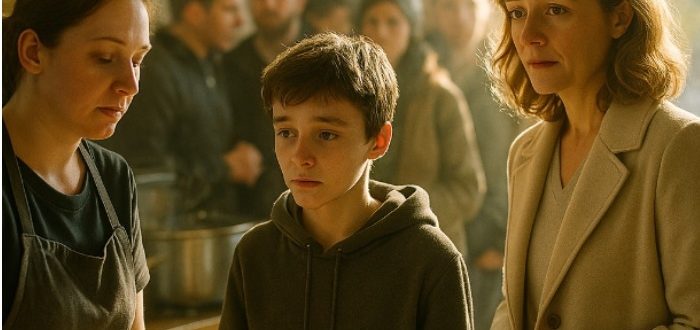 Stătea la coadă, obosită după tura ei, ținând în mână o pungă cu cumpărături. În fața ei stătea un băiat de vreo doisprezece ani, slab, cu capul plecat