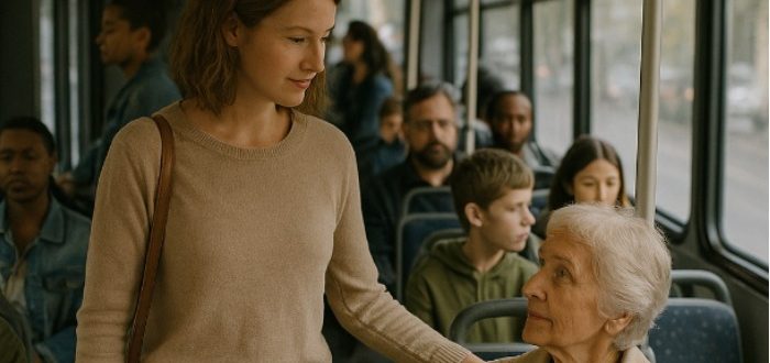 Autobuzul era aglomerat. Era ora de vârf de seară, iar oamenii erau obosiți și iritați, unii strângându-și gențile, alții cărând telefoane, alții pur și simplu încercând să nu